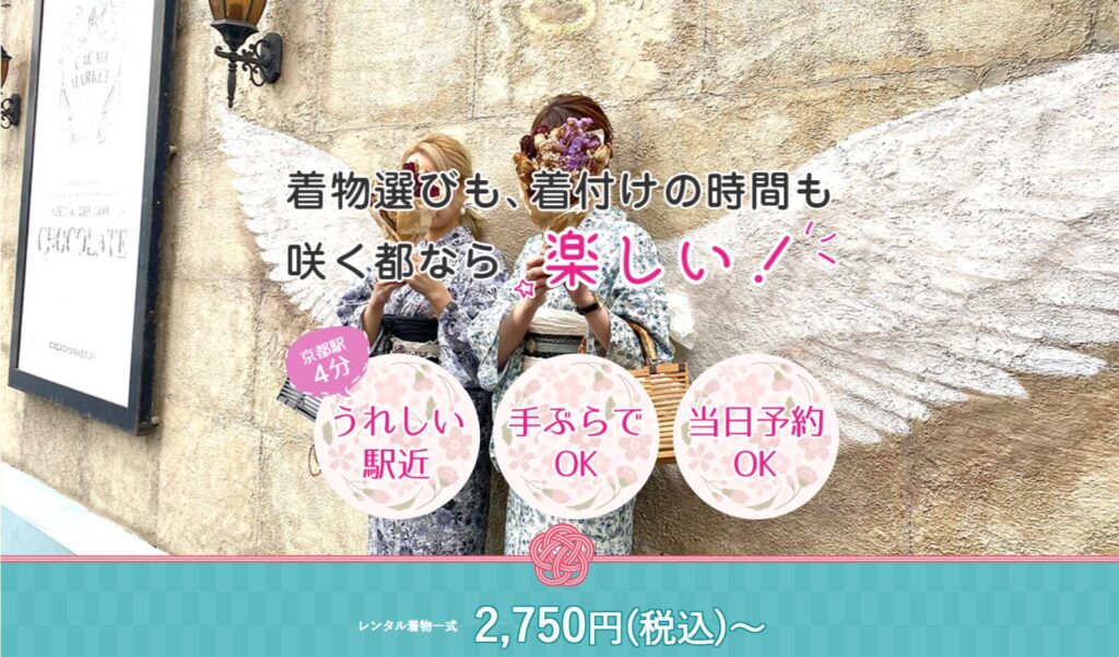 推し色コーデをしたいけど、オプション料金が積み上がるのは不安…という方には、京都駅前や祇園に店舗を構える「咲く都」がおすすめです。