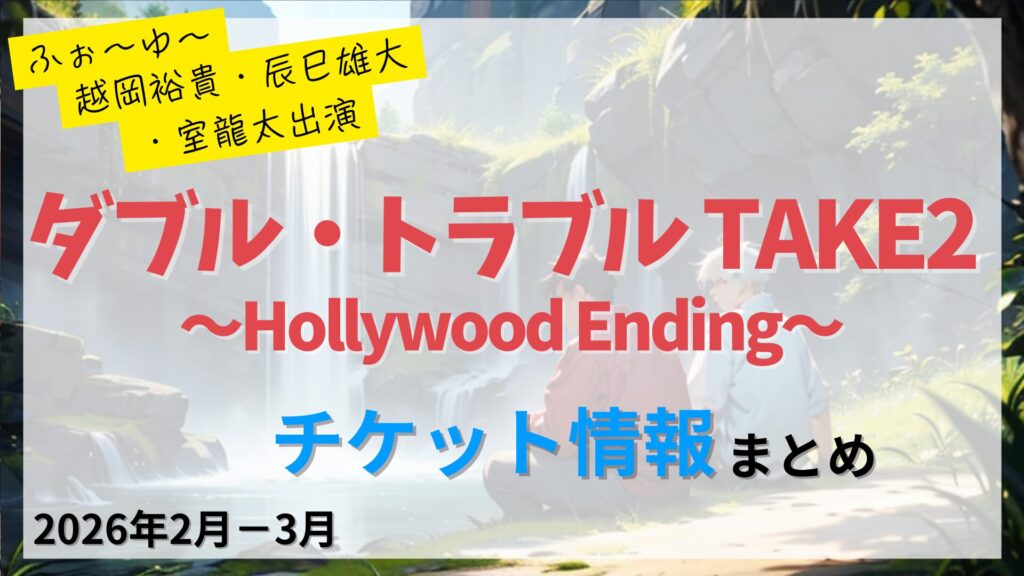 以上、【越岡裕貴・辰巳雄大・室龍太 出演】ミュージカル『ダブル・トラブル TAKE2~Hollywood Ending~』のFC先行・カード枠・一般販売のチケット情報まとめでした。