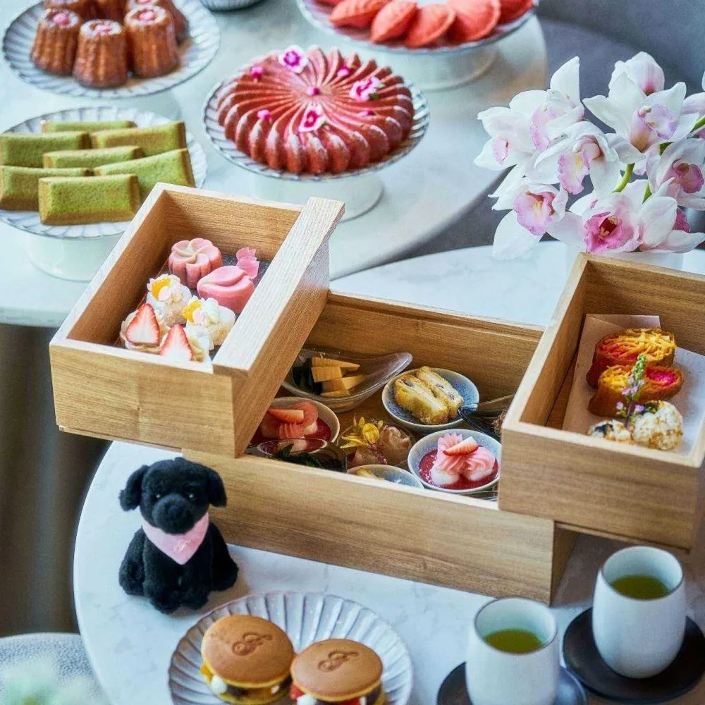 鮨「みぎわ」と鉄板焼「燈辻」の料理長が監修した特別メニューで、桜鯛や筍など春の旬を使った彩り豊かなセイボリーが並びます。ボックスを開けた瞬間に思わず写真を撮りたくなる華やかな盛り付けも魅力。さらに桜パウンドケーキや桜カヌレなど、焼き菓子トロリーサービスも楽しめます。