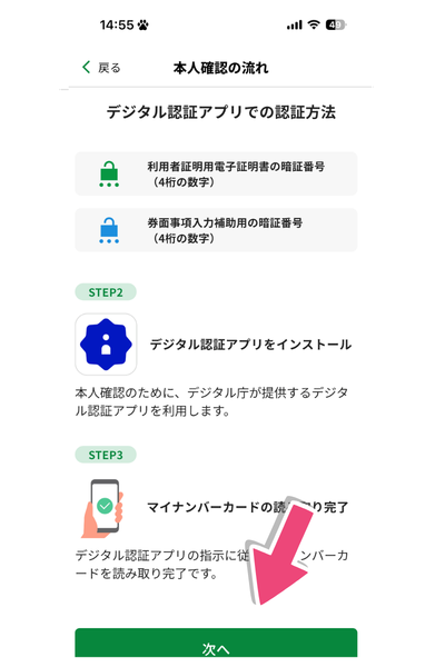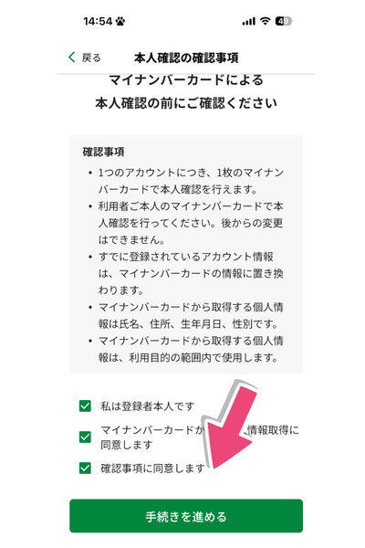 アプリの案内に従い、マイナンバーカードをスマホにかざして本人確認を行います。