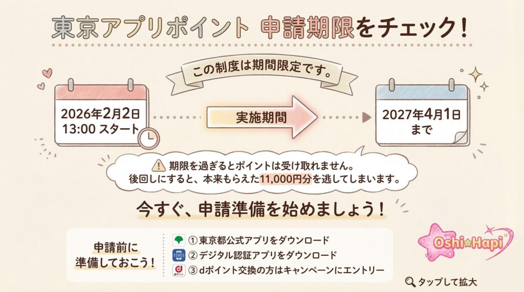 - 東京アプリ生活応援事業:2026年2月2日13:00~2027年4月1日まで