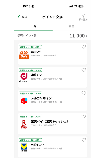 貯まったポイントは1ポイント1円として、現金やギフト券、電子マネーなどに交換可能です。